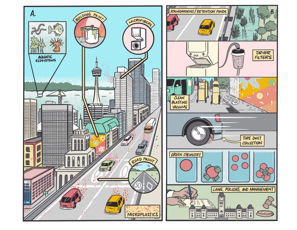 Secondary microplastics are emitted to the environment from an array of sources, though pollution control measures exist. The diagram depicts in (A) sources of secondary microplastics from the built environment, including paints on buildings, road/tire wear, and fibers that can enter the environment. These sources are highly prevalent but often forgotten. In (B), solutions to capture and/or prevent secondary microplastics are presented.